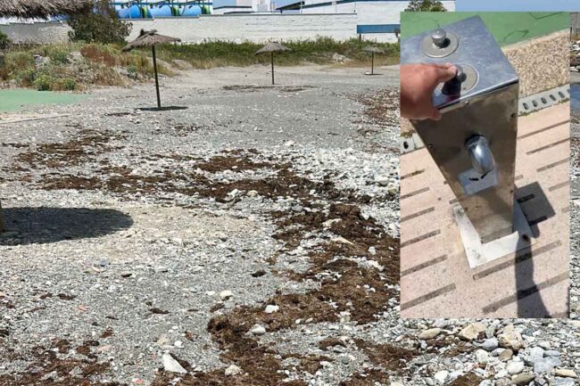 La playa de Benítez próxima a la desaladora vuelve a ser objeto de quejas. La zona de baño en Ceuta, en el inicio de la temporada, no cuenta con agua en el aseo ni en las duchas. Los vecinos que emiten las reclamaciones también señalan que no ha sido completamente retirada del alga invasora que ocupa el arenal.