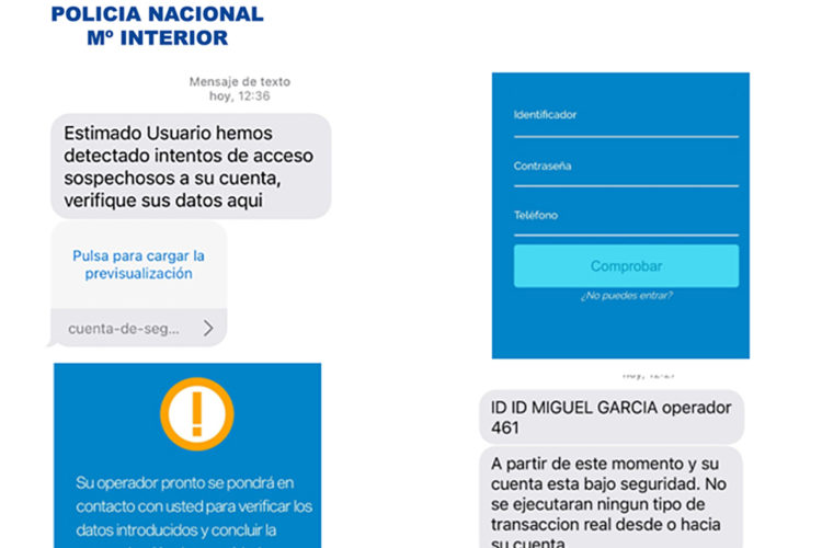 El modus operandi comienza con la recepción de SMS en el que la víctima recibe una alerta, al parecer de su entidad financiera, con el siguiente texto: “Hemos detectado intentos de acceso sospechosos a su cuenta. Debe activar su sistema de seguridad web o bien su cuenta quedará bloqueada”. Los mensajes pueden presentar ciertas variaciones, indica el CNP (Cuerpo Nacional de Policía) pero siempre incluyen un enlace para que la víctima pueda acceder directamente a su banco. Sin embargo, ese enlace en realidad conduce a una página falsa donde le solicitan los datos bancarios y personales, así como el usuario y contraseña de acceso a su banca online y un teléfono de contacto. Además, advierten a sus víctimas que recibirán una llamada para realizar las verificaciones de seguridad oportunas.