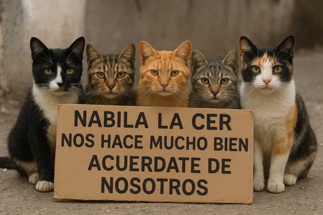 Lo que denuncia en los medios de comunicación el PSOE sobre la CER es totalmente cierto. Y, en el caso de que no lo fuese, que lo demuestren con datos y no diciendo pamplinas una detrás de otra. Que la consejera de Sanidad, Nabila, publique claramente cuántas esterilizaciones se han hecho en este último mes y quiénes han sido las personas que han capturado a esos gatos. Que lo haga, y detalladamente, con datos confirmados y contrastados, nada de palabrería barata que solo perjudica a los pobres gatos que viven en la calle.