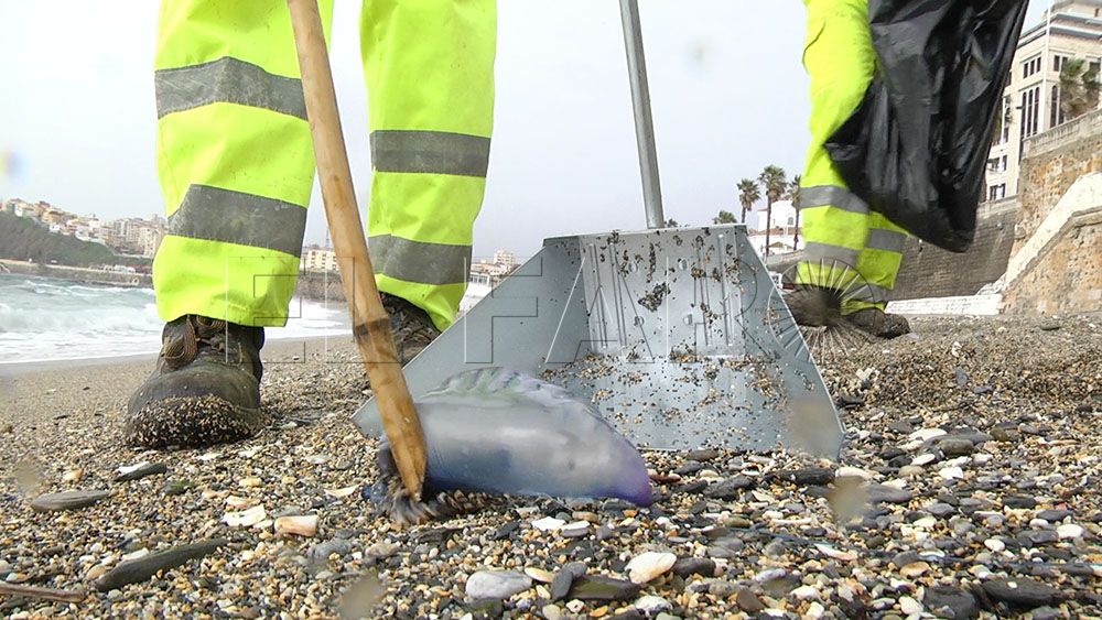 El temporal trae una plaga de carabelas portuguesas a la playa de la Ribera