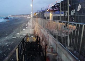 La pasarela de la playa del Tarajal ha quedado inservible después de los tres incendios que sufrió en la noche ...
