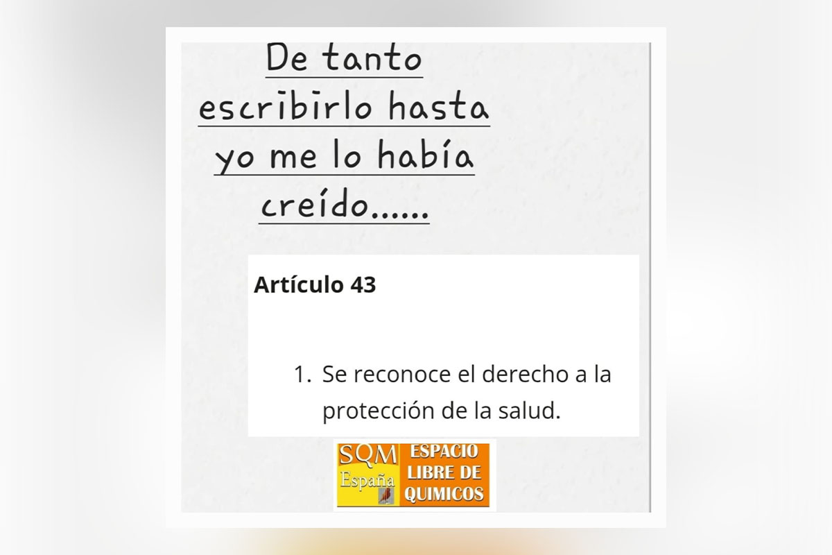 En los puntos 1 y 2 del artículo 43 de nuestra Constitución, se reconoce el derecho a la protección de la salud y se indica que compete a los poderes públicos organizar y tutelar la salud pública a través de medidas preventivas y de las prestaciones y servicios necesarios. La Ley, establecerá los derechos y deberes de todos al respecto. Y por supuesto nosotros, los ciudadanos, nos lo creemos aunque la realidad sea bien distinta..... Recientemente, una clínica privada perteneciente a la red de una de las compañías aseguradoras más potentes del país, se ha negado a realizar una intervención quirúrgica a una enferma de Sensibilidad Química Múltiple (SQM), no porque no la precisara, sino por el simple hecho de padecer esta enfermedad cuando la cirugía era prioritaria para evitar si la situación se complicaba, que hubiera que realizarla de forma urgente con peligro para su vida.
