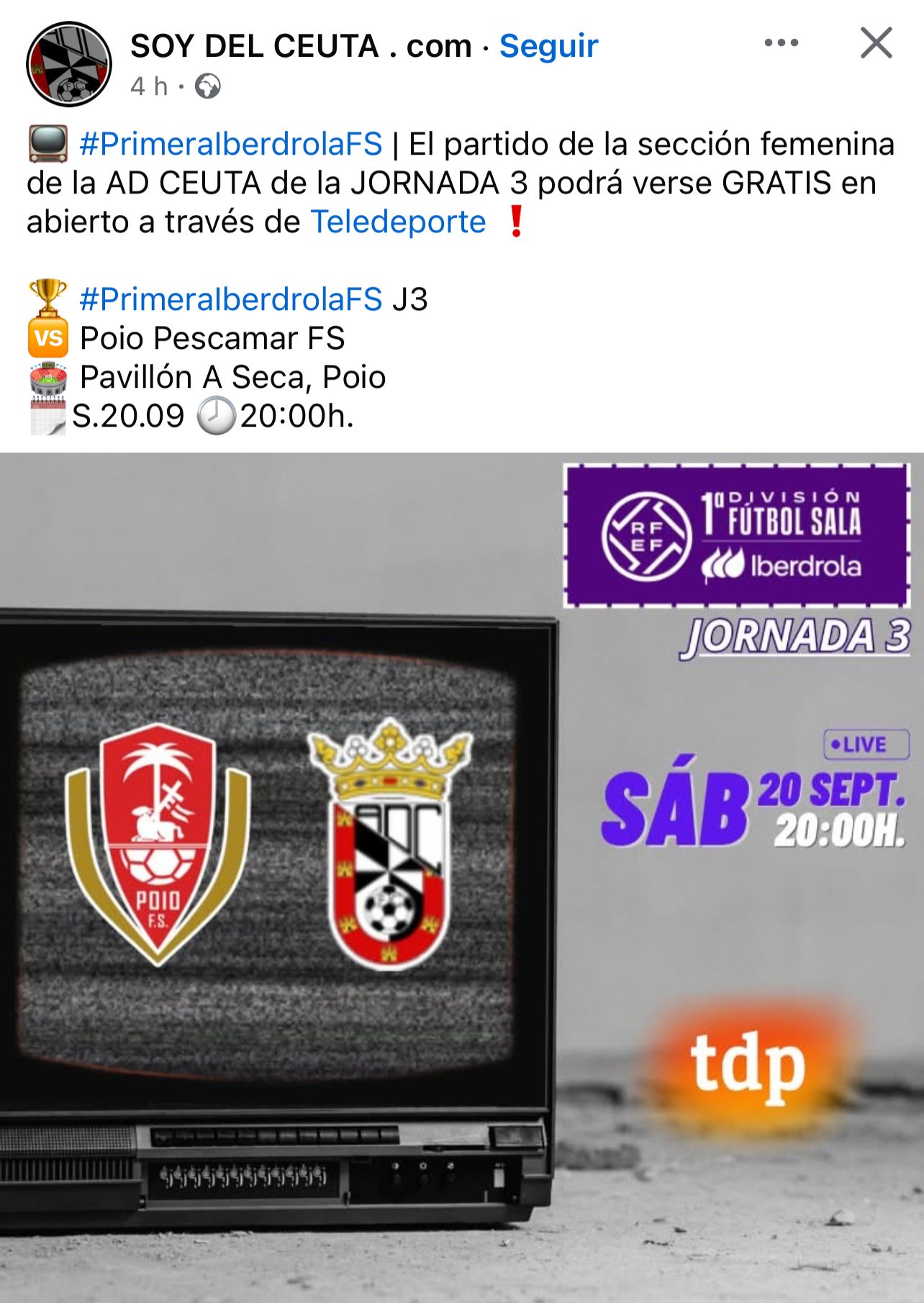 La cadena pública de deportes emitirá el duelo de las caballas correspondiente a la Jornada 3. En él, la AD Ceuta se enfrentará a las jugadoras del Poio Pescamar FS. El duelo será el sábado 20 a las 20:00.