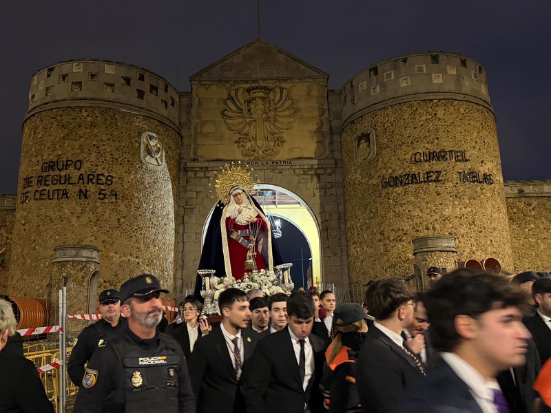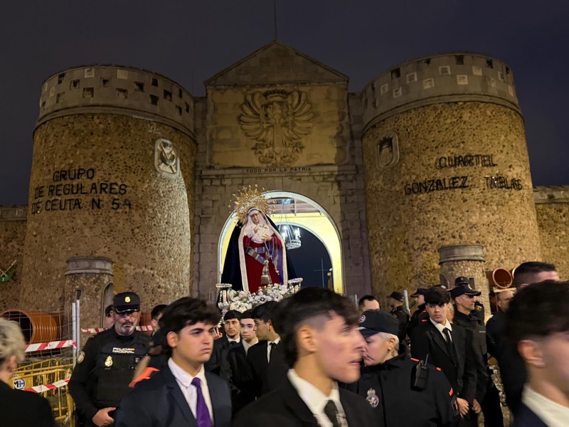 A la altura del acuartelamiento González Tablas, cuartel del Grupo de Regulares nº54 de Ceuta, el Señor de Ceuta y Nuestra Señora de los Dolores, junto a miembros de la corporación y las autoridades civiles y militares, han hecho una parada para llevar a cabo la tradicional liberación del preso.