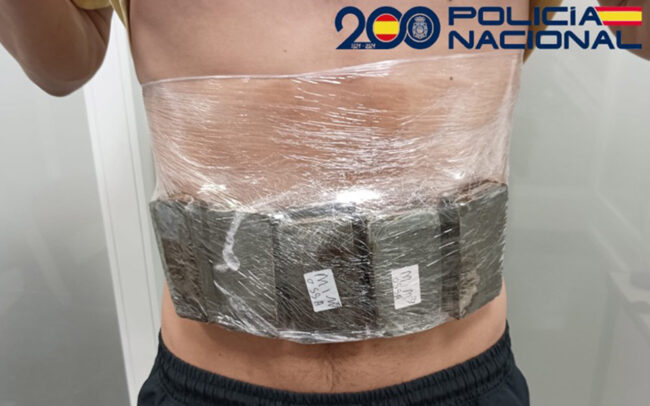 Es en ese instante cuando el joven se levantó la camiseta y el policía pudo observar que portaba varias placas de hachís adosadas a su cuerpo mediante film transparente.