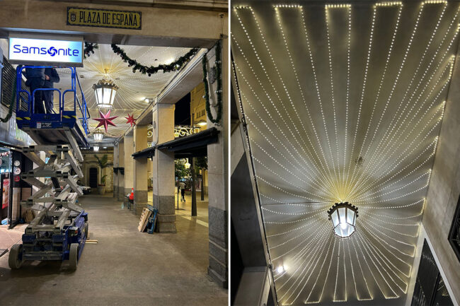 Los impulsores y propulsores de la idea fueron los establecimientos Granier y 100 Montaditos, que encargaron el proyecto a Electricidad Capa. Según explican desde CAPA el reto era grande. ¿Qué tipo de iluminación utilizar?; ¿Cómo instalarla sin alterar el tránsito?; ¿Cómo lograr que el efecto fuera envolvente sin saturar visualmente el espacio? Fueron preguntas que se respondieron sobre el terreno, con visitas y pruebas de intensidad, color y distribución. El resultado: 700 metros de guirnalda de microled y alrededor de 35.000 puntos de luz que ahora envuelven el soportal como si fuese un pequeño corredor mágico en pleno corazón de la ciudad.