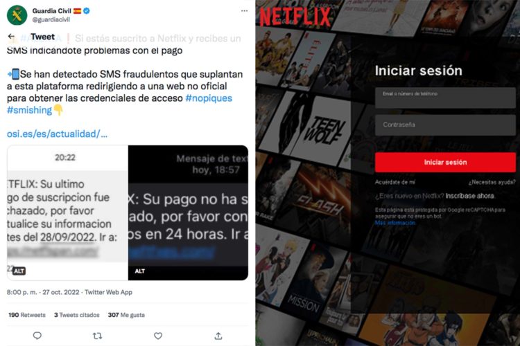 Si está suscrito a Netflix y recibe un SMS indicándole problemas con el pago, lo mejor es desconfiar inmediatamente y comunicarse directamente con atención al cliente por los canales regulares, sobre todo porque la Guardia Civil ha advertido a través de sus redes sociales que "se han detectado SMS fraudulentos que suplantan a esta plataforma redirigiendo a una web no oficial para obtener las credenciales de acceso".