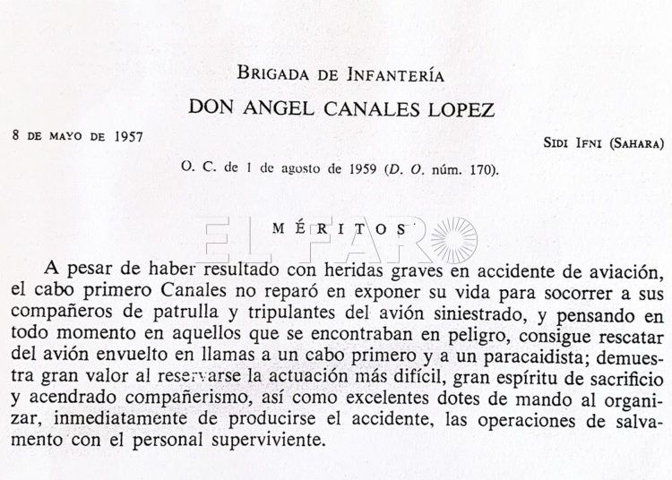 En el Diario Oficial del Ejército N.º 170 del 1 de agosto de 1959, se le concedía al entonces cabo 1º Ángel Canales López la ‘Medalla Militar Individual’ cuyo texto así dice: “a pesar de haber resultado herido con lesiones graves el cabo 1º Canales, no reparó en arriesgar su vida para socorrer a sus compañeros de patrulla y tripulantes del avión siniestrado, pensando en todo momento en aquellos que se encontraban en peligro. A pesar del peligro, consigue rescatar de entre las llamas a un cabo 1º y a un paracaidista, demostrando un gran valor, un gran espíritu de sacrificio y acendrado compañerismo, así como muchas dotes de mando al apoyar inmediatamente después de producirse el accidente con la ayuda del personal presente”.