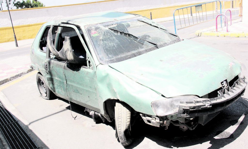 En el estado que muestra la imagen quedó este vehículo después de que un muro junto a la Comisaría de los Rosales se desprendiera provocando graves desperfectos en el coche. El 112 se alertó a Bomberos del derrumbe y de la peligrosidad del muro y hasta el lugar de los hechos se trasladaron los efectivos del SEIS con el fin de sanear la zona, además de derruir los restos susceptibles de caer.