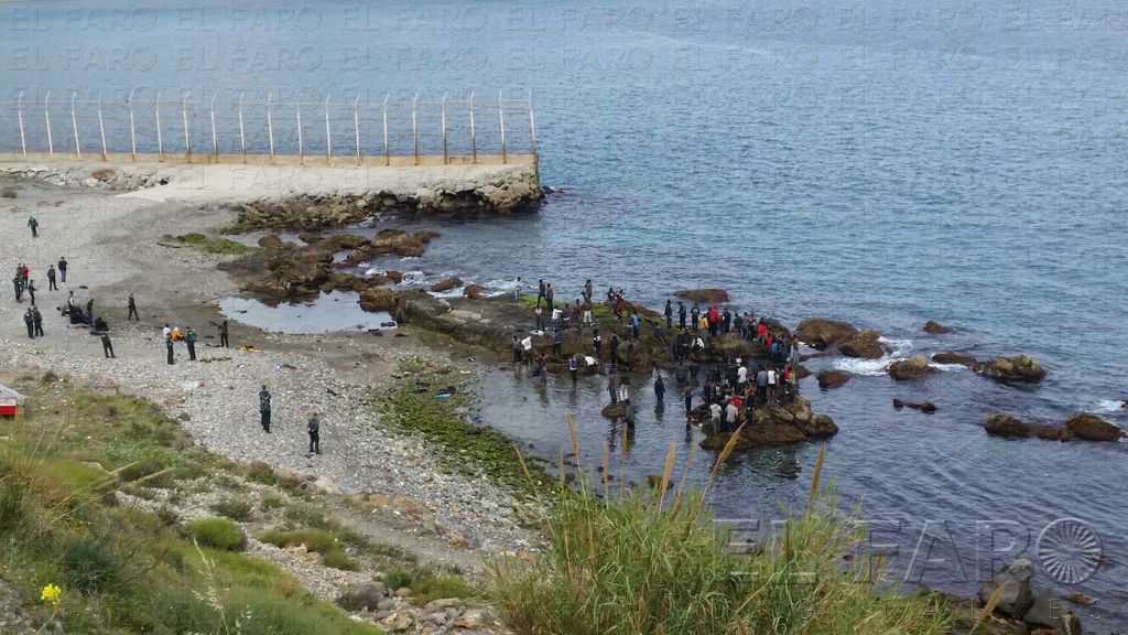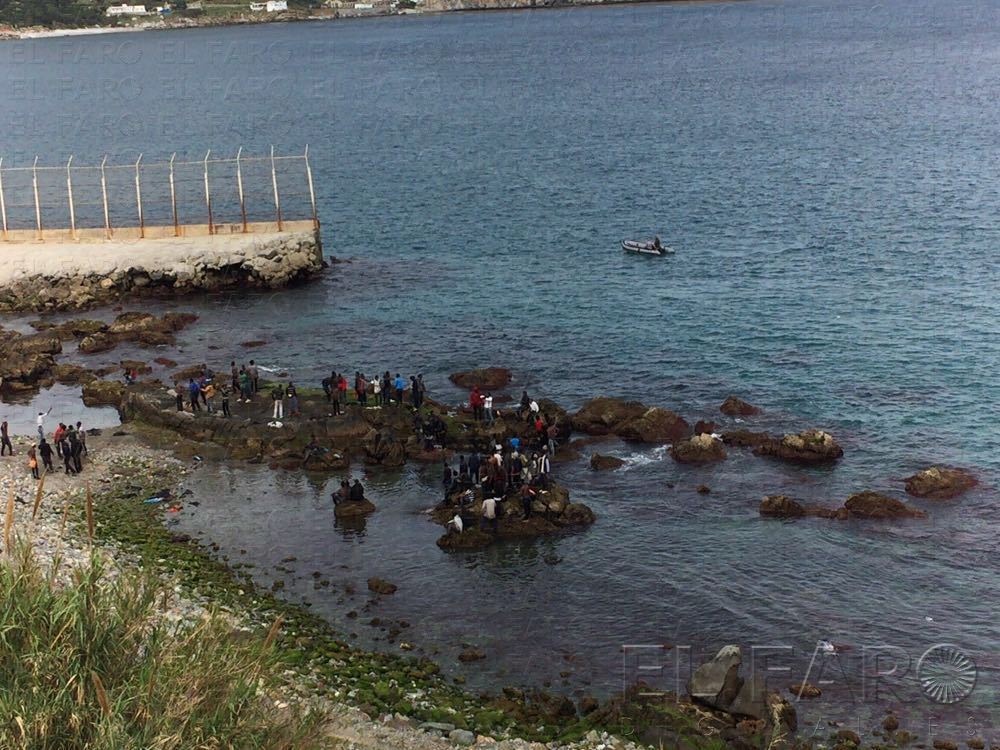 Los inmigrantes se subieron a las rocas de la playa nada más cruzar el espigón fronterizo. "Tenemos miedo a que nos devuelvan, por eso no salimos de las rocas", decían algunos. Después pasaron a los arenales.