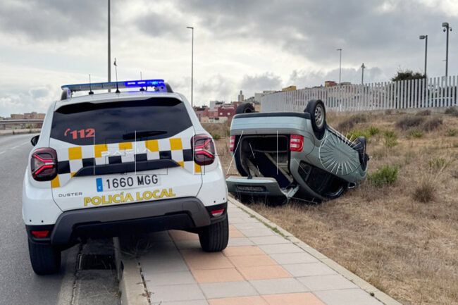 Aparatoso accidente en la zona del embolsamiento de Loma Colmenar, en Ceuta. Un coche ha terminado volcando después de caer desde la carretera del hospital, la que está justo por encima de la explanada.