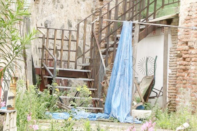 Un carro de compra, hierros olvidados, un carrito de obra, cubetas, botellas de plásticos, latas, bolsas de basura, una lona rajada, lo que parece un antiguo equipo de música sobre un banco bajo el techado de este rincón y malas hierbas que crecen sin un cuidado aparente.