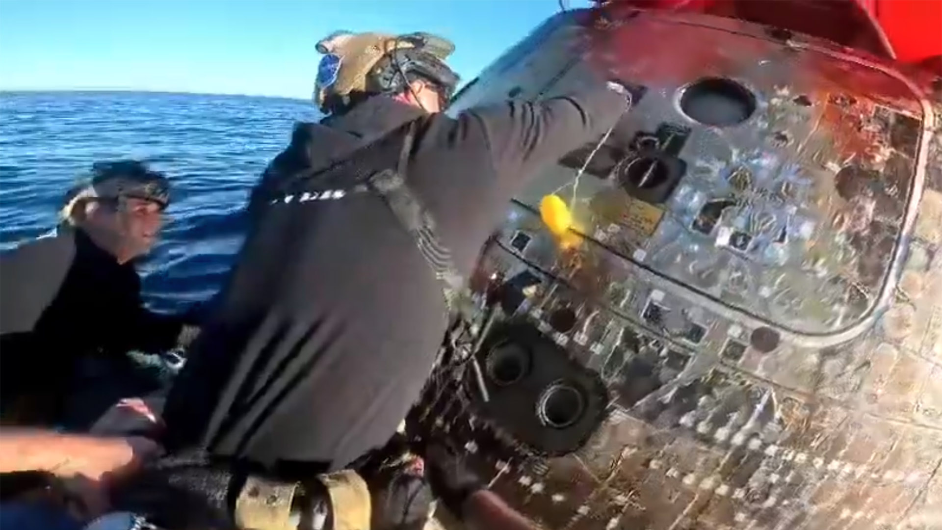 En él se observa la apertura de la cápsula y el recibimiento de la tripulación, que emerge aparentemente en buen estado tras diez días de misión. La escena, acompañada de gestos de alivio y celebración, refleja la culminación de un viaje que estuvo cargado de simbolismo y exigencias técnicas.