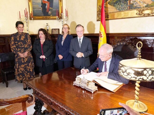 La recepción oficial ha tenido lugar a las 10.15 horas por la Puerta Noble del Palacio de la Asamblea, donde el presidente ha dado la bienvenida al representante del Ministerio de Hacienda. Durante este acto protocolario, Jesús Gascón ha firmado en el Libro de Honor de la Ciudad, dejando constancia de su visita institucional.