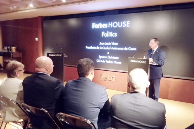 El presidente de la Ciudad, Juan Vivas, ha intervenido esta tarde en el Club Forbes House de Madrid con una conferencia organizada por esta entidad de reciente creación. Tras ser presentado por el CEO de Forbes House, Ignacio Quintana, Vivas ha iniciado una ponencia en la que abordó numerosos temas de actualidad, pero que aprovechó para reivindicar Ceuta como “un destino atractivo para emprender e invertir”.
