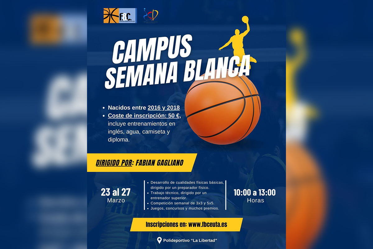 El Campus de Semana Santa Blanca de Baloncesto estará dirigido por Fabián Gagliano y supervisado por la Federación de Baloncesto de Ceuta. Esta actividad incluye, además, desarrollo de cualidades físicas básicas, que estarán impartidas por un preparador físico, trabajo técnico, dirigido por un entrenador superior y competición semanal de 3x3 y 5x5 además de juegos, concursos y muchos premios para todos los participantes.