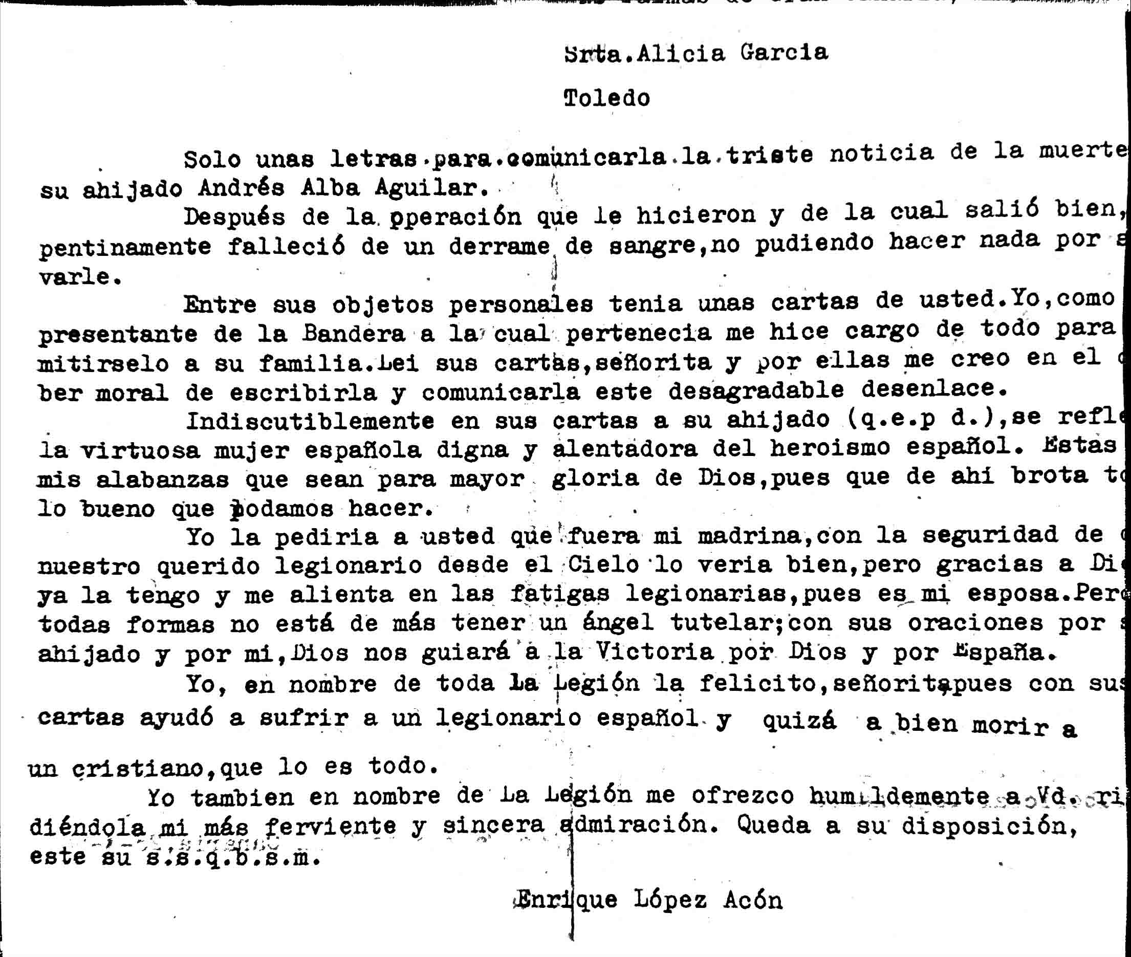 Como mencioné anteriormente, en uno de los combates de la VI Bandera de La Legión en Ifni, este cabo legionario, Andrés Alba Aguilar, resultó herido, siendo trasladado al Hospital Militar de Las Palmas. El día 26 de marzo de 1958, Alicia recibía una carta firmada por el sargento legionario Enrique López Acón en la cual le comunicaba que su ahijado había fallecido como consecuencia de las graves heridas.